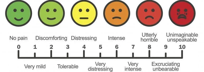 9-10 – Excruciating pain. Unable to converse. Crying out and/or moaning uncontrollably.